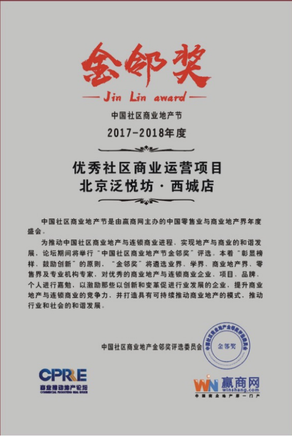 开启社区商业战略新纪元 建设精彩城市生活新征程 ——北京泛悦坊·西城店荣获“金邻奖”