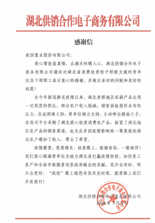 7月10日,湖北省供销合作电子商务有限公司致信KY开元置业,感谢公司在抗击新冠肺炎疫情期间协助湖北爱心扶贫农产品的销售,为加快贫困地区复产复工做出的贡献。